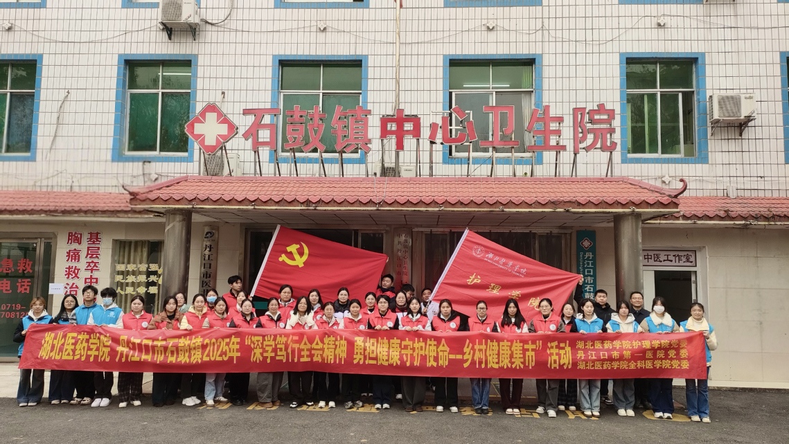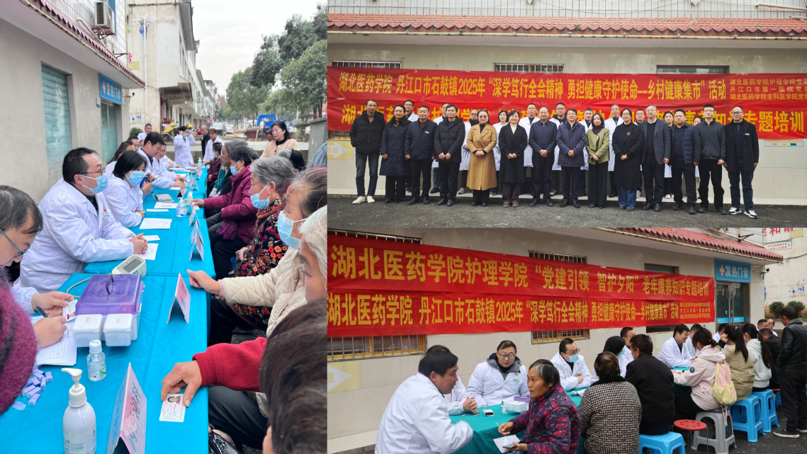 本网讯(通讯员文/李龙霞 张振桐 图/黄金涛 黄蔷)为深入贯彻落实全会精神,聚焦群众健康需求。12月2日,湖北医药学院护理学院党委联合丹江口市第一医院党委、丹江口市石鼓镇党委,以“深学笃行全会精神 勇担健康守护使命”为主题,在石鼓镇举办我校“健康集市”走进乡村首站活动。我校党委副书记、组织部部长张海蛟,护理学院党委书记王桂琴,十堰市卫健委党组成员、副主任张桃桃,丹江口市第一医院党委书记刘勋,石鼓镇党委书记熊欣等领导出席,校院村三方党员干部、医疗专家、师生志愿者及当地群众百余人共同参与。活动通过健康义诊、急救培训、爱心慰问与健康科普、校院合作洽谈等形式,将优质医疗服务送达“守井人”身边。