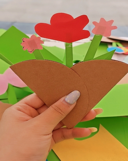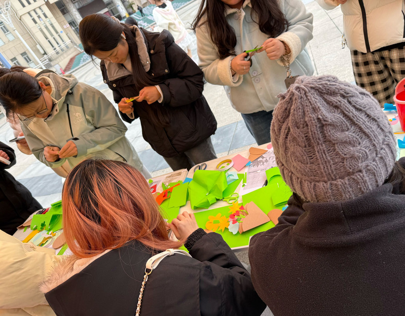 活动现场温馨欢乐、其乐融融,参与活动的同学们将一张张普通的卡纸裁剪折叠成精致灵动的纸艺花束,每一朵手工花都承载着专属心意,在轻松愉悦的制作中体验温情与乐趣。