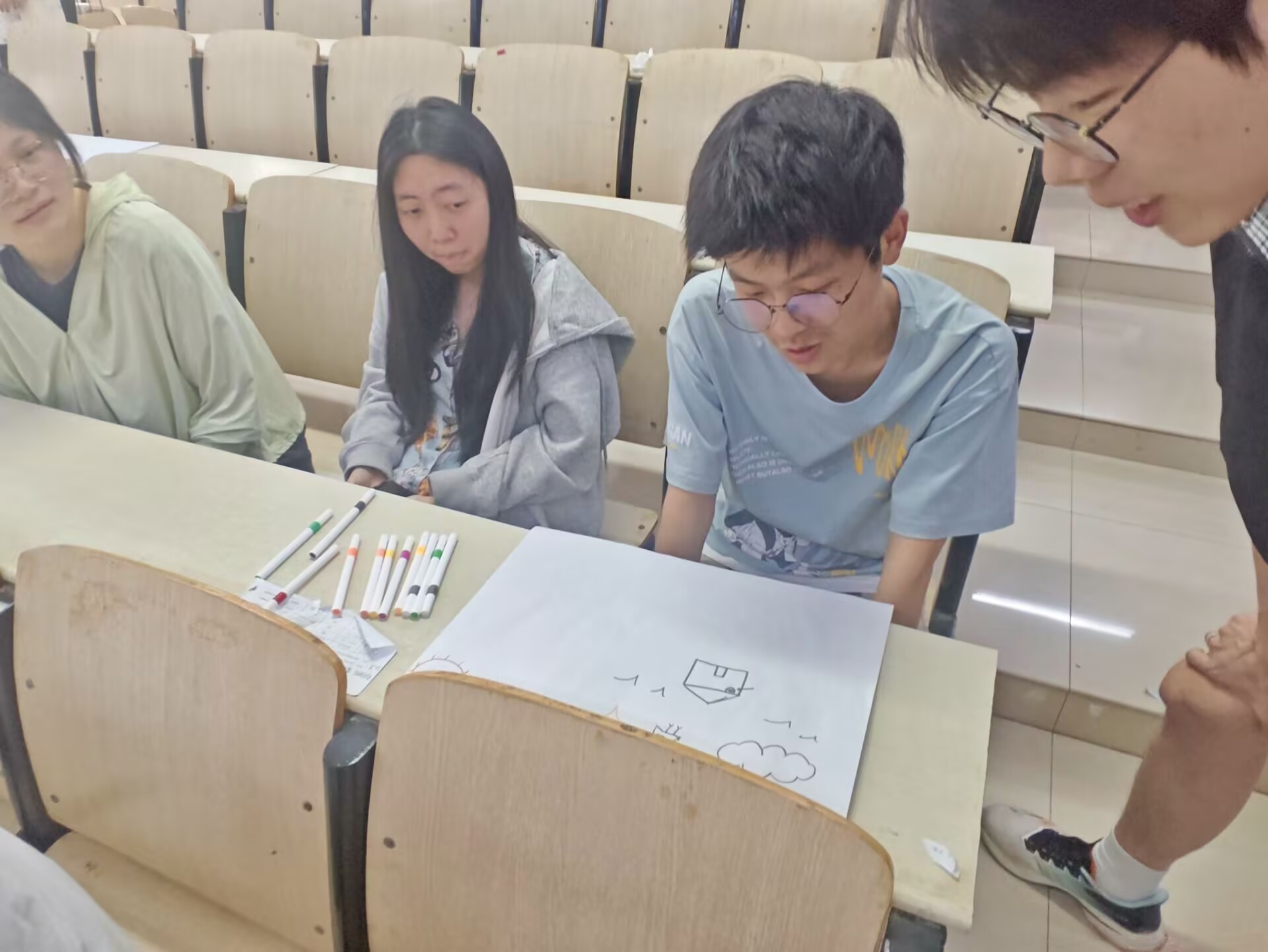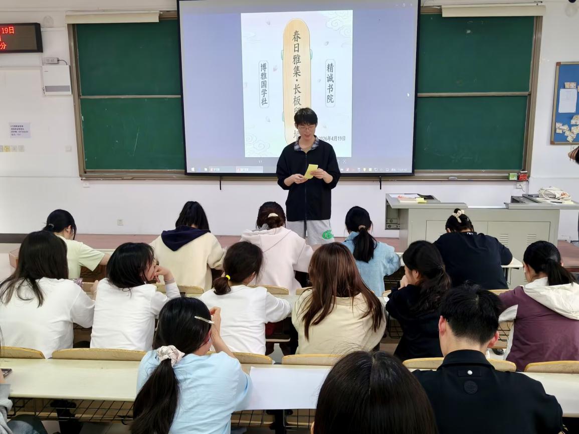 “词语猜猜画”环节中,同学们5—6人一组,围绕杨柳、纸鸢、细雨、书卷、墨香等兼具春日意境与书香气息的词语即兴简笔画、限时猜词。大家凝神构思、默契配合,挥笔勾勒、巧妙提示,教室里欢声笑语不断。随后的“诗语接龙”将活动推向高潮,同学们依次吟诵与春、书、友相关的经典诗句,或引经据典,或轻声咏叹,在诗词流转中感受中华诗词的韵律之美,在经典诵读中传承文化根脉。